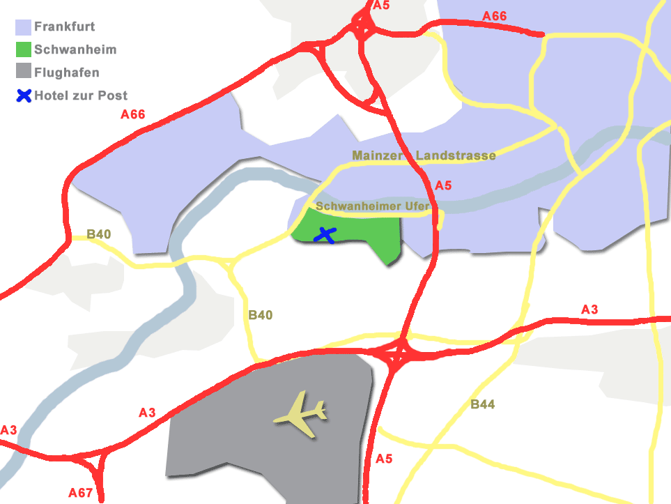 Mit dem Auto Richtung Frankfurt Flughafen, ab da ca. 4km bis Schwanheim (siehe Anfahrtsskizze). Vom Hauptbahnhof mit der Straßenbahnlinie 12 bis Schwanheim Endstation (ca. 7km, Fahrtzeit ca. 30 Minuten). Vom Flughafen mit dem Taxi ca. €10,- Zur Messe mit dem Auto ca. 8km, mit öffentlichen Verkehrsmitteln ca. 35-40 Minuten.